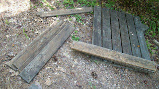 While the Wee Teen and I were canning peaches at Sheri's, the Hus-Man put together a raised bed for the soon-to-be-rescued garden.